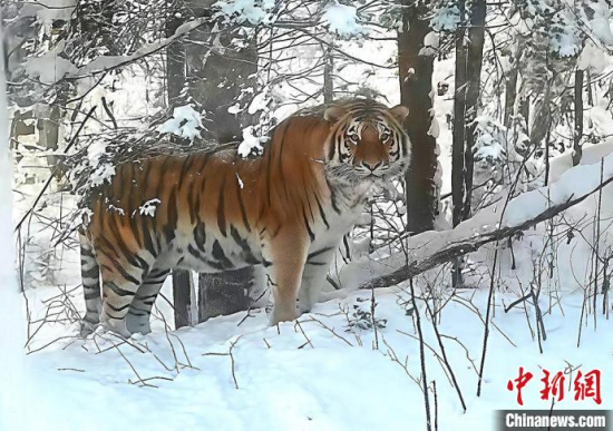 12月3日,長白山保護區(qū)工作人員發(fā)現(xiàn)的野生東北虎,拍攝時與老虎距離不到10米。 (吉林省林業(yè)和草原局供圖)