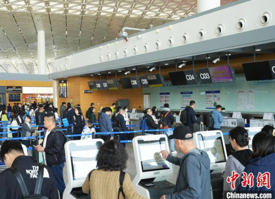 清明假期,旅客在長春龍嘉國際機(jī)場排隊值機(jī)。(吉林機(jī)場集團(tuán)供圖)