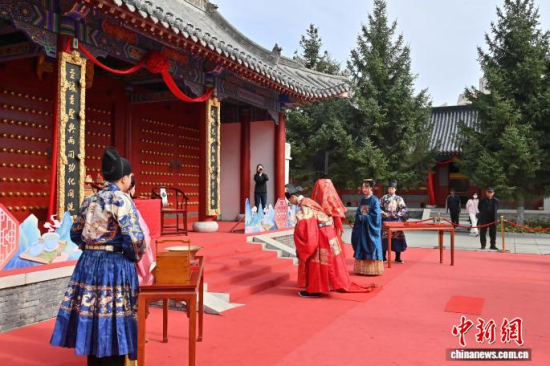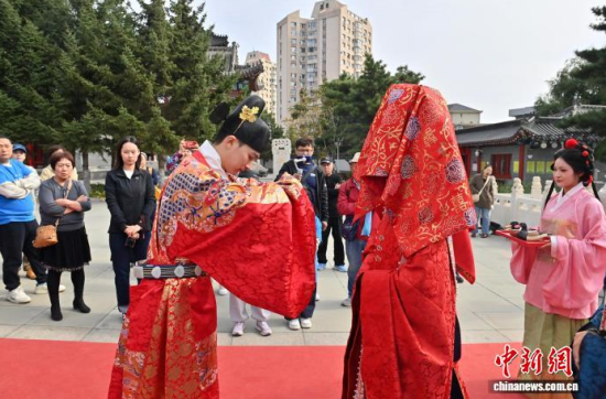 10月7日,吉林長春文廟舉行了一場明制漢婚沉浸式展演。漢服愛好者依次呈現(xiàn)奠雁、同牢、合巹等傳統(tǒng)禮儀,生動(dòng)還原明代婚俗,F(xiàn)場通過流程講解與道具展示,解讀禮儀背后古人對(duì)婚姻與美好生活的寄愿。中新社記者 張瑤 攝