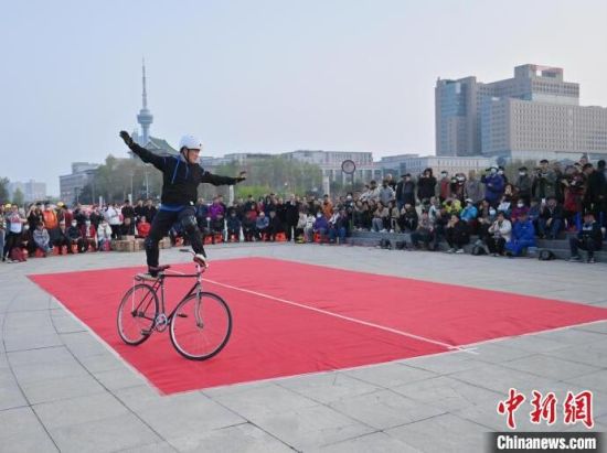 4月24日,在長春市文化廣場內(nèi),64歲的市民周長春表演自行車花樣絕技。站立騎行、脫把騎行等一系列驚險刺激的動作被周長春完成得十分精彩,吸引市民圍觀。