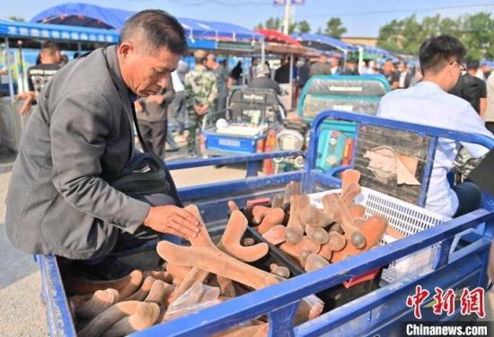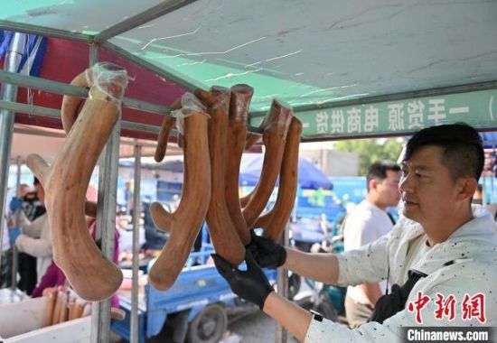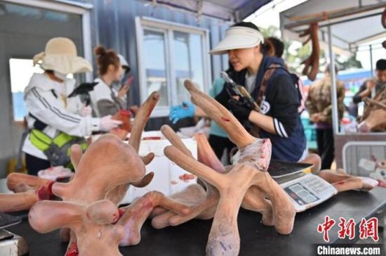 6月26日,位于長春市雙陽區(qū)的鹿茸交易市場,商戶在緊張忙碌。每年的五月至十月是梅花鹿鹿茸收割的季節(jié),“中國梅花鹿之鄉(xiāng)”長春市雙陽區(qū)鹿鄉(xiāng)鎮(zhèn)也熱鬧起來,客商云集在已有上百年歷史的梅花鹿鮮茸交易市場,搶抓鮮茸上市時機,爭取采購到質(zhì)量上乘的鮮鹿茸。(中新社記者 張瑤 攝)