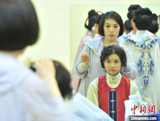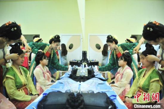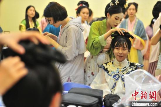 7月9日,吉林四平,2024年全國臺聯(lián)第二十一屆臺胞青年千人夏令營吉林分營的30余位臺胞青年參加傳統(tǒng)文化講座,學習漢服禮儀、漢服種類劃分等知識,并第一次穿上漢服進行體驗,感受傳統(tǒng)文化之美。圖為臺胞青年在進行漢服妝造。