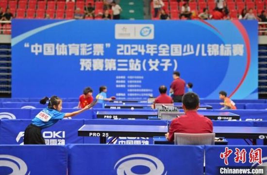 8月6日,吉林長春,選手在比賽。當(dāng)天,2024年全國少兒乒乓球錦標(biāo)賽預(yù)賽第三站(女子)在長春開賽,來自全國47個代表隊的少兒乒乓球運動員同場比拼球技。(中新社記者 張瑤 攝)