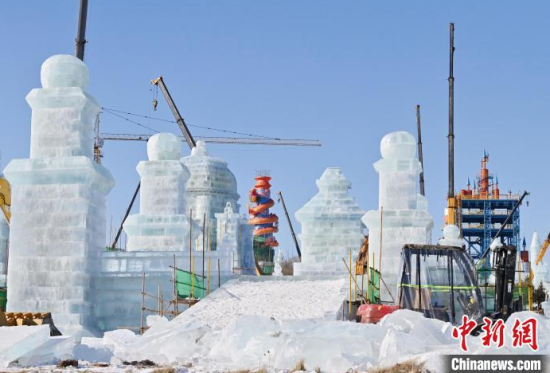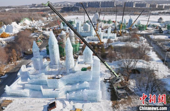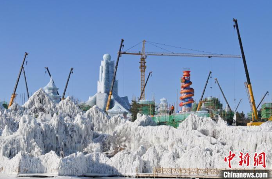 12月11日,吉林長春,工作人員正在長春冰雪新天地緊張施工。今年長春冰雪新天地總占地面積達到156萬平方米,冰雪雕塑200組創(chuàng)歷屆之最,并設(shè)置1314米的空中雪漂流、520米的冰滑梯等設(shè)施供中外游客游玩。中新社記者 張瑤 攝