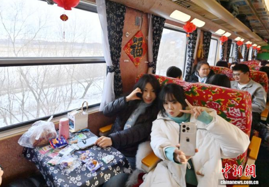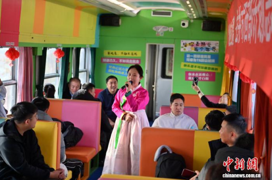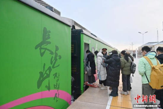 12月3日,直達(dá)長(zhǎng)白山的龍井民俗旅游專列鳴笛啟程,開(kāi)啟冬日樂(lè)賞冰雪之旅。該專列融合“冰雪+民俗”雙重主題,每節(jié)車廂各成一道風(fēng)景,絢麗多彩的民俗風(fēng)情貫穿全程。車窗外,壯美的林海雪原不斷掠過(guò),吸引游客觀賞。據(jù)悉,該專列將在每周末往返兩地。中新社記者 張瑤 攝